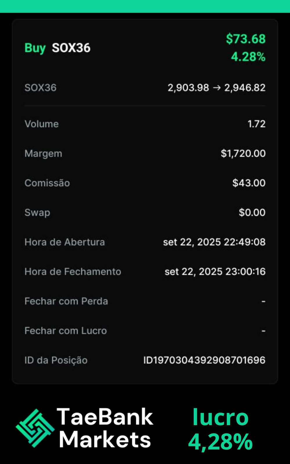 Como trader com a TAEBANK, você pode esperar uma experiência de trading online excepcional que combina tecnologia de ponta com serviços centrados no cliente. Nossa plataforma de trading é projetada para atender às necessidades dos traders modernos, respaldada por uma filosofia orientada para o futuro que prioriza seu sucesso nos mercados financeiros.
